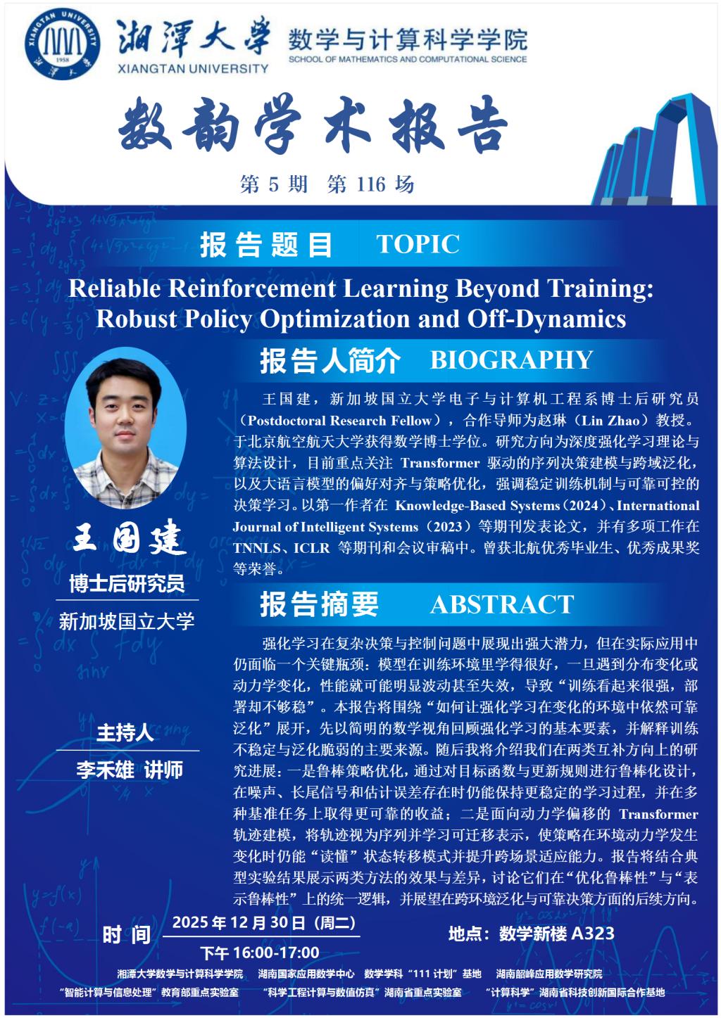 数韵学术报告-王国建-Reliable Reinforcement Learning Beyond Training: Robust Policy Optimization and Off-Dynamics Transformers