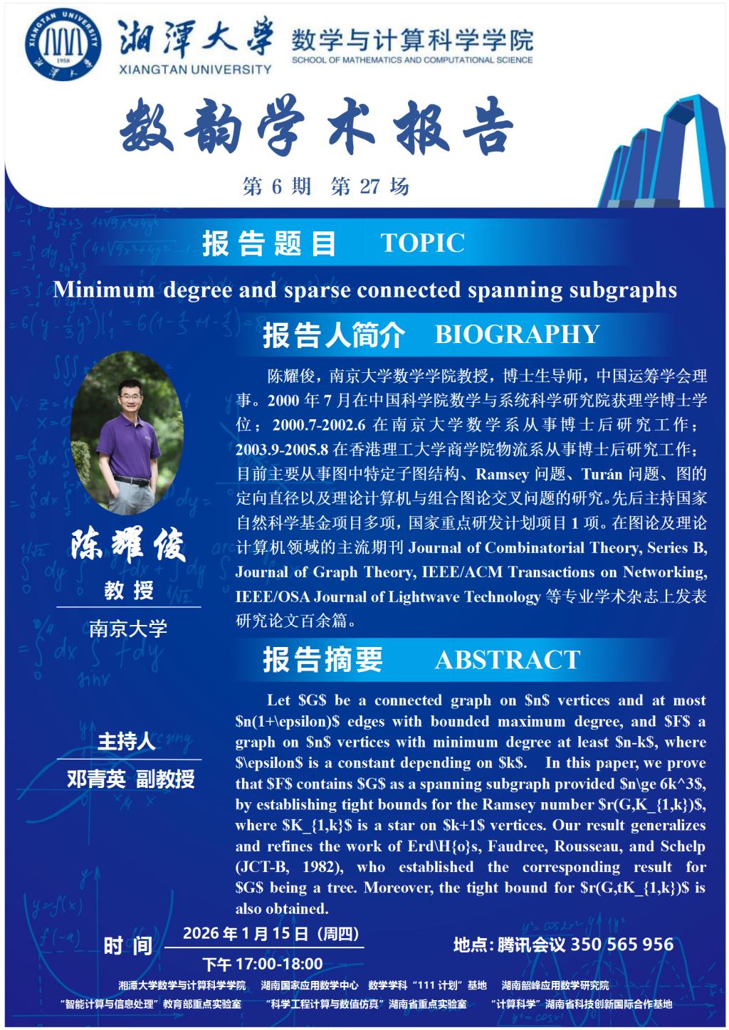 数韵学术报告-陈耀俊-Minimum degree and sparse connected spanning subgraphs