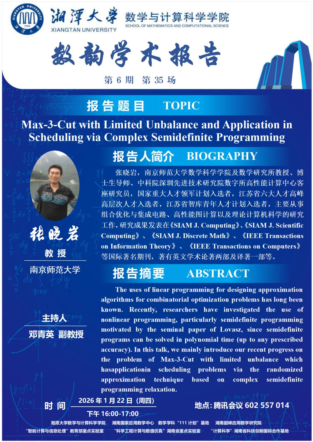 数韵学术报告-张晓岩-Max-3-Cut with Limited Unbalance and Application in Scheduling via Complex Semidefinite Programming
