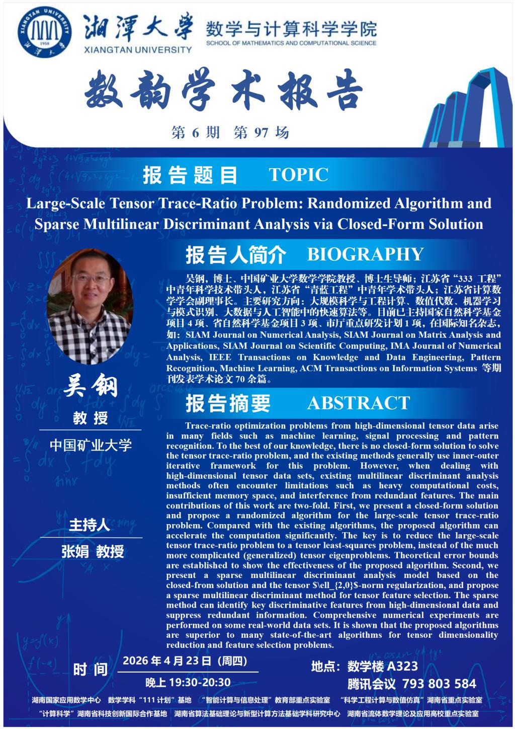 数韵学术报告—吴钢—Large-Scale Tensor Trace-Ratio Problem: Randomized Algorithm and Sparse Multilinear Discriminant Analysis via Closed-Form Solution